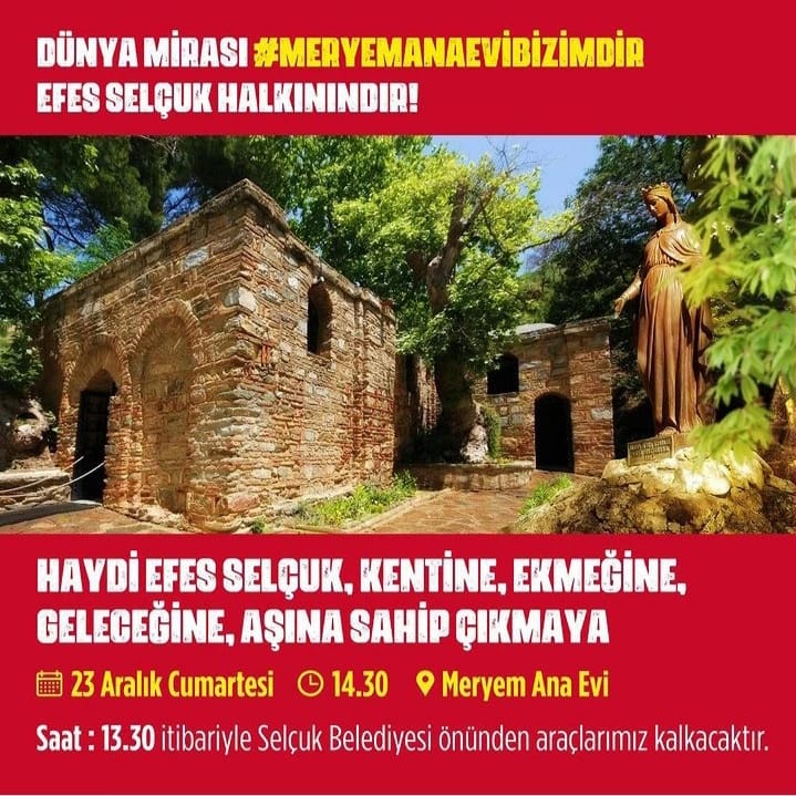 Efes Antik Kenti, Ayasuluk ve Çukuriçi Höyüğü ile birlikte Meryemana Evi de UNESCO Dünya Kültür Mirası Asıl Listesine dâhil edilmişti. Meryemana Evi’nin işletmesinin yerel belediyeden alınması girişimine karşı ilçe halkı 23 Aralık Cumartesi günü “Meryem Ana Bizimdir” sloganıyla seslerini duyuracak. Saat 14:30’da Meryemana Evi önünde yapılması planlanan etkinliğe yoğun bir katılımın olması bekleniyor.