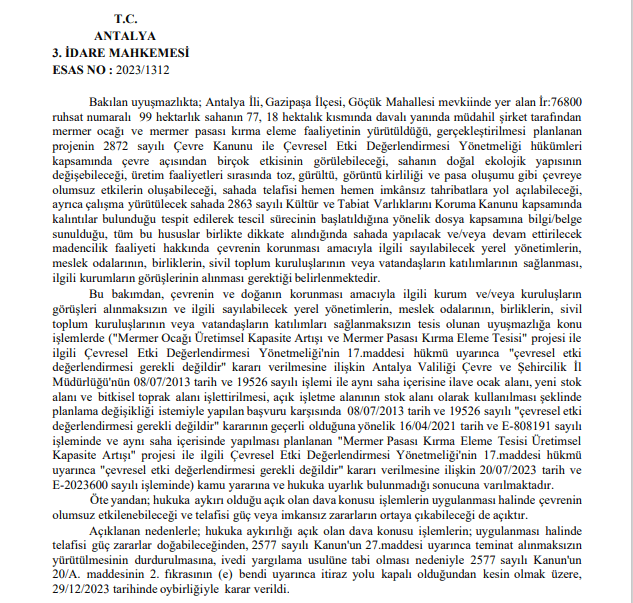 Gazipaşalı köylülerin açtığı davayı gören Antalya 3. İdare Mahkemesi, Göçük Mahallesi’ndeki mermer ocağı ve kırma eleme tesisiyle ilgili Valiliğin verdiği ÇED Gerekli Değildir kararını iptal etti. Gazipaşa-Anamur karayoluna bitişik alanda yaklaşık 100 hektarlık ruhsat sahasına sahip olan mermer ocağı 2013 yılında faaliyete geçmiş, ancak verimli rezerv çıkmayınca bir süre sonra faaliyete ara verilmişti. Ruhsat alanından çıkarılan malzemeyi inşaat sektöründe değerlendirmek isteyen maden şirketi, mermer ocağı izni verilen alanda kapasite artışına giderek mermer yanında mıcır ocağı işletmeyi planladı. Bununla ilgili hazırlanan proje dosyasına Antalya Valiliği Çevre, Şehircilik ve İklim Değişikliği İl Müdürlüğü 20 Temmuz 2023 tarihinde ÇED Gerekli Değildir kararı verdi.