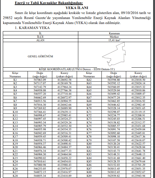(Karaman’da YEKA alanı olarak ilan edilen arazilerle ilgili karar 1 Şubat’ta Resmi Gazete’de yayımlandı.)