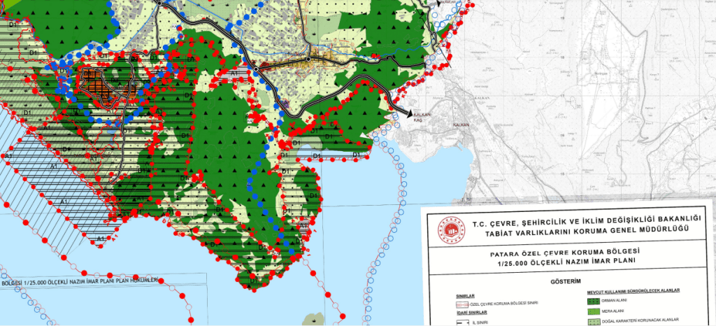 Çevre, Şehircilik ve İklim Değişikliği Bakanlığı tarafından 2022 yılında Patara ÖÇK Bölgesi için hazırlanan 1725 binlik Nazım İmar Planı, yapılan itirazların değerlendirilmesinin ardından 5 Haziran 2023 tarihinde onaylanarak askıya çıkarıldı. Ancak yeni yapılaşma alanları yaratan ve betonlaşma baskısını artırmaya yönelik olduğu ileri sürülen plana karşı WWF-Türkiye, Mimarlar Odası Antalya Şubesi ve Kaş Çevre ve Kültür Derneği iptal davası açtı.