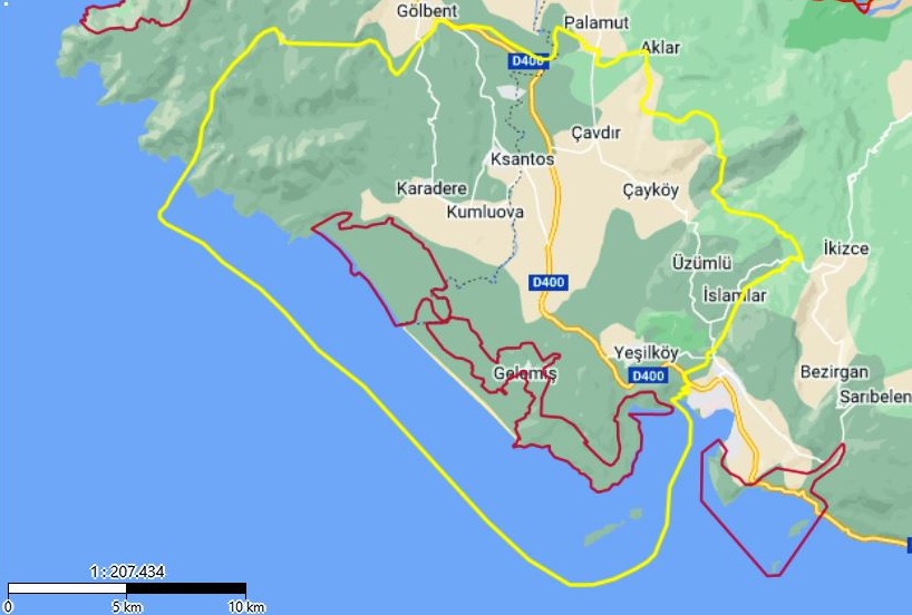 (Patara ÖÇK Alanı sınırları sarı çizgi içindeki bölgeyi kapsıyor. Kırmızı çizgi içindeki alanlar ise kesin korunacak alan olarak ayrılan bölgeler. ÖÇK Bölgesi içinde ayrıca arkeolojik sit alanları bulunuyor.)