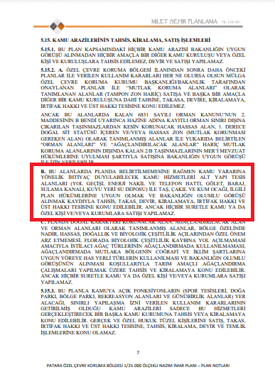 Plan notlarının kamu arazileriyle ilgili bölümünde ise kesin korunacak alanlar ile orman alanları dışında kalan 2/B arazilerinde Bakanlığın uygun görüşü alınarak irtifak hakkı ve üst hakkı tesisine izin verilebileceği kaydedilerek, “Bu alanlarda, planda belirtilmemesine rağmen kamu yararına yönelik ihtiyaç duyulabilecek alt yapı tesis alanları ile taş, çakıl ve kum ocağı, ilgili plan hükümlerine uygun olmak ve Bakanlığın olumlu görüşü alınman kaydı ile tahsis, takas, devir, kiralamaya, irtifak hakkı ve üst hakkı tesisine konu edilebilir. Ancak hiçbir suretle kamu ya da özel kişi veya kurumlara satışı yapılamaz” ifadelerine yer veriliyor.