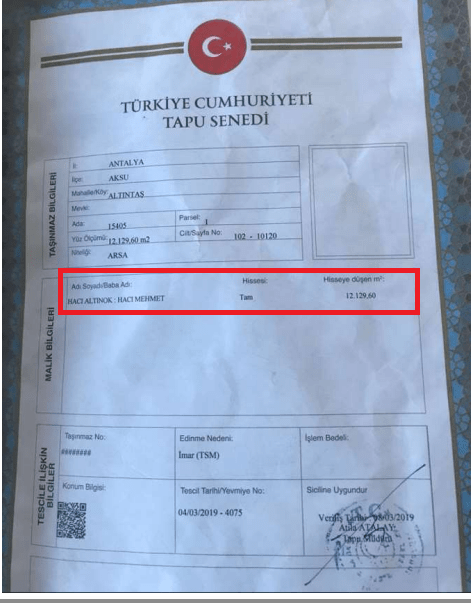 12 BİN M2’LİK ARSA HACI ALTONOK ADINA KAYITLI