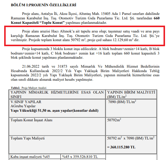 AKP’nin Ankara Büyükşehir Belediye Başkan adayı Turgut Altınok’un mal varlığını açıklamasıyla başlayan tartışmalar Antalya’ya kadar uzandı. Altınok’un Antalya’da 660 dairesi bulunduğu ve bunu mal varlığı arasında açıklamadığı gündeme geldi. Antalya’nın Aksu ilçesine bağlı Altıntaş Mahallesi’nde bulunan ve 2020’de inşaatına başlanan konut projesinin ayrıntılarına ulaştık. Tapu kaydında ve proje dosyasında Hacı Altınok’a ait olduğu görülen 12.129 m2’lik arazi üzerinde yükselen 660 konut kapasiteli inşaatların Müteahhitliğini, Antalya Büyükşehir Belediyesi Spor Kulübü Başkanı Ramazan Karabulut’un yaptığı ortaya çıktı. Lüks otomobillere olan düşkünlüğüyle gündeme gelen Karabulut, CHP’li Antalya Büyükşehir Belediye Başkanı Muhittin Böcek’in akrabası olarak biliniyor. Böcek, önceki gün Aksu Altıntaş’ta düzenlenen iftar buluşmasında yaptığı konuşmada, “Müteahhitler bizim canımızdır, kardeşimizdir ancak sadece Müteahhitler yetmez. Buranın babadan atadan kalma yer sahipleri Aksululardır” ifadelerini kullanarak projelerini anlattı.