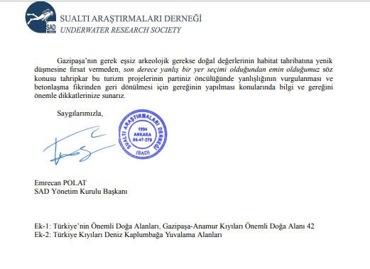 Öte yandan dev kütleli yıkıcı bir turizmin getirilmeye çalışıldığı, kısıtlı ölçüdeki Gazipaşa kıyı bandı, farklı derecelerde doğal ve arkeolojik korunan alanlardır. Üstelik şu anda ÇED aşaması başlayan ilk devasa turizm tesisi de korunan alandadır. Ayrıca, her betonlaşmanın küresel ısınmaya ve sonucunda iklim krizine katkı verdiği gerçeği de unutulmamalıdır. Dolayısıyla bu büyük çaplı turizm projeleri zinciri şeklinde devam edecek inşaatlarla Antalya ilinin denize kıyısı olan 12 ilçesi arasında betonlaşmadan nasibini almamış tek ilçesinin ‘her şeye rağmen kalkınma’ ya da ‘ne pahasına olursa olsun turizm’ ideolojisine yenik düşmemesi gerekir. Gazipaşalıların, yöre halkının büyük oranda istemediği bu doğa ve tarih yıkımlarının ne kadar olumsuz sonuçlara yol açabileceğini bilimsel veriler ile yayınlanmış rapor ve makaleleri paylaşmaya her zaman hazır olduğumuzu belirtiriz. Bunlardan sadece iki tanesi yazı ekinde verilmiştir. Sadece Sualtı Araştırmaları Derneği değil, gerek Gazipaşa’dan gerekse ulusal düzeyde diğer STK’lar ve akademik kuruluşlar da bu bilgileri siz veya danışmanlarınızla paylaşacaklardır. Yeter ki iletişim kanalları açık olsun.