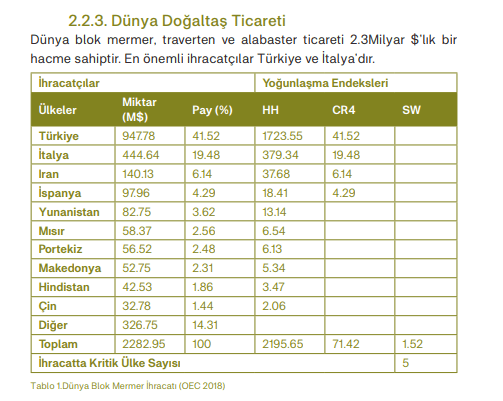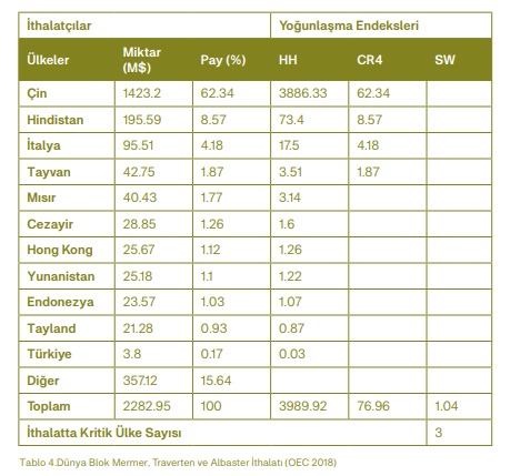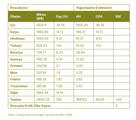 (Dünyada en fazla doğal taş ithal eden ülke olan Çin, aynı zamanda işlenmiş doğal taş ihracatında da başı çekiyor. Bir başka deyişle Çin blok olarak aldığı doğal taşı işleyip satarak sektörde bir tekel oluşturmuş durumda… Kaynak: (İMİB)
