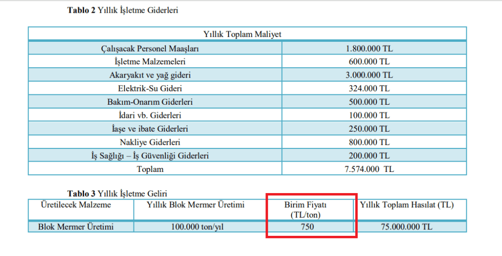 (Mermer ocağı için hazırlanan ÇED raporunda bir ton mermerin 750 TL’den satılacağı bilgisine yer veriliyor. Yıllık net karın ise 49 milyon TL olduğu belirtiliyor. Üstte)