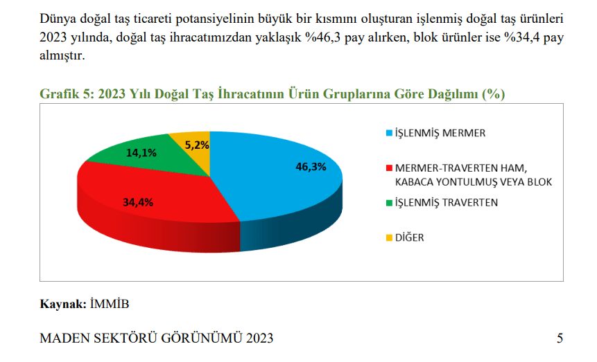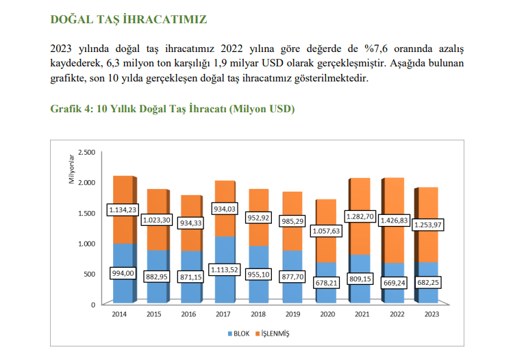 İstanbul Maden İhracatçıları Birliği (İMİB) tarafından hazırlanan değerlendirme raporunda, Türkiye’nin 2023 yılındaki doğal taş ihracatı 6,3 milyon ton oldu. Mermer, traverten gibi ürünleri blok ya da işlenmiş olarak ihraç eden Türkiye 2023 yılında elde ettiği doğal taş geliri 1,9 milyar Dolar oldu. Türkiye dağını taşını kesip sattığı Çin ve Hindistan’dan tarım ürünü, ABD’den badem ve ceviz ithal ederek her yıl yüzlerce milyon doları geri ödüyor.