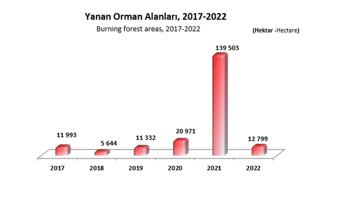 Maden izinleri orman yangınlarıyla da yarışıyor. OGM verilerine göre 2012’de 10.454, 2017’de 11.993, 2018’de 5604 hektar orman yandı. Cumhuriyet tarihinin en büyük orman yangınlarının yaşandığı 2021’de ise 139.503 hektar orman yandı. 2022’de 12.799 hektar orman yanarken, 2012-2022 dönemindeki orman yangınlarının toplamı 236.425 hektar.