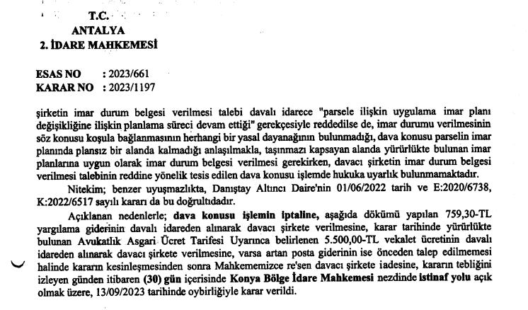 Bunun üzerine Fettah Tamince’nin şirketi Muratpaşa Belediyesi’nin 19 Nisan 2023 tarihli işleminin iptali için Antalya İdare Mahkemesi’nde dava açtı. Davaya bakan Antalya 2. İdare Mahkemesi, 13 Eylül 2023 tarihli kararı ile Muratpaşa Belediyesi’nin işlemini iptal etti. Mahkemenin iptal kararında, davalı şirketin söz konusu parsele ilişkin imar durum belgesi verilmesi talebinin, “parsele ilişkin uygulama imar planı değişikliği süreci devam ettiği” gerekçesiyle reddedildiği belirtilerek, bu gerekçenin yasal dayanağı bulunmadığı kaydedildi. Kararda, dava konusu parselin imar planında plansız bir alanda kalmadığı vurgulanırken, taşınmazı kapsayan alanın mevcut durumuna uygun imar durum belgesi verilmesi gerekirken, bu talebin reddine yönelik işlemde hukuka uyarlık bulunmadığı belirtildi.