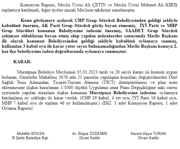 Parselin bulunduğu alandan sorumlu olan Muratpaşa Belediye Meclisi 3 Ağustos 2022’de aldığı kararı Büyükşehir Belediye Meclisine havale etti. Antalya Büyükşehir Belediye Meclisi ise 10 Kasım 2022 tarih, 923 sayılı kararında, yapılaşma koşulları değiştirilmeden 1/1000 Ölçekli Uygulama İmar Planı Değişikliğini kabul ederek onayladı. Bunun ardından askı süresi içinde plan değişikliğine 3 ayrı itiraz başvurusu yapılırken Muratpaşa Belediyesi, itirazların kısmen kabulüne karar verdi. Değişiklik yapılan planda yer verilen “subasman kotu kuzeydeki yoldan alınacaktır” plan notunun kaldırılmasına karar veren Muratpaşa Belediye Meclisi, 5 Ocak 2023 tarihli oturumunda değişikliği onaylayarak Büyükşehir Belediyesine havale etti.