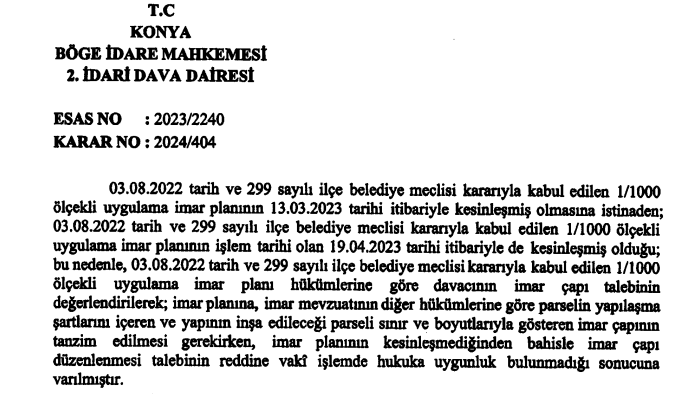 Büyükşehir Belediye Meclisi’nin düzenlemeyi geri iade ettiği 13 Mart 2023 tarihi itibari ile ilgili parseli kapsayan 1/1000 ölçekli uygulama imar planının kesinleştiği belirtilen Mahkeme kararında, üç aylık zaman diliminde emredici yasa gereği onaması ya da değiştirerek onaması gerekmekte iken, büyükşehir belediye meclisi hiçbir karar almadığı için planın kesinleştiği belirtildi. Kararda, parselle ilgili imar çapı talep edilen 19 Nisan 2023 tarihi itibari ile imar planının kesinleşmesiyle ilgili bir ihtilafın bulunmadığı da vurgulandı.
