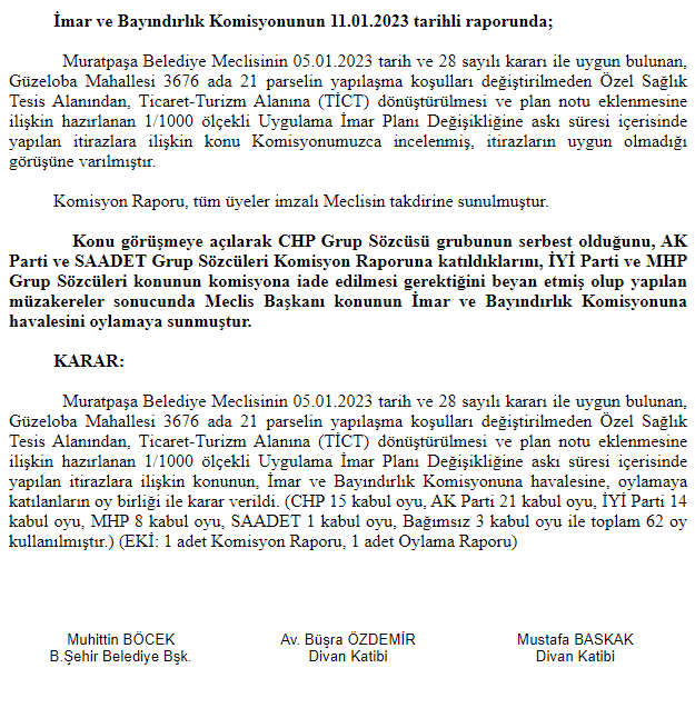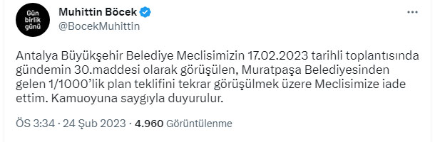 (Üstte, ilk sırada Büyükşehir Belediyesi Meclisi’nin 17 Şubat 2023 tarihli imar değişikliği talebini komisyona havale eden kararı, ikinci sırada 13 Mart 2023 tarihli düzenlemeyi ilçe belediyesine iade eden kararı ve son olarak Başkan Muhittin Böcek’in 24 Şubat 2023 tarihli paylaşımı)