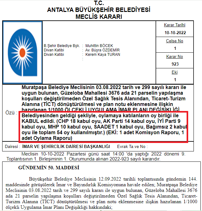 (Antalya Büyükşehir Belediye Meclisi, ilçe belediyesinden gelen plan değişikliğini 7 Eylül 2016’da onaylıyor. Oylamada, CHP’nin grup olarak ret oyu vermesi dikkat çekiyor.)