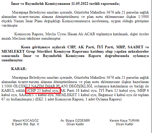 ‘Özel Şahıs’ notuyla belediyelere sunulan plan değişikliği raporlarında Tamince’nin ya da şirketinin adının geçmemesine özen gösteriliyordu. Tamince’nin parseli için hazırlanan değişikliği kapsayan 1/5000 Ölçekli Nazım İmar Planı, 16 Mayıs 2022 tarih, 540 sayılı kararla Antalya Büyükşehir Belediye Meclisi’nde onaylandı. Bu kez Büyükşehir Belediyesi CHP’nin yönetimindeydi ve 2016’da Tamince’nin plan değişikliğine grup olarak ret oyu veren CHP, 25 kabul oyu vermişti. Plan değişikliği, CHP’nin 25 kabul uyunun yanı sıra AKP’nin 18, İYİ Parti’nin 12, MHP’nin 6, Saadet ve Memleket partilerinin 1’er, 4 de bağımsız meclis üyesinin oylarıyla ‘oy birliği’ ile kabul edilmişti.