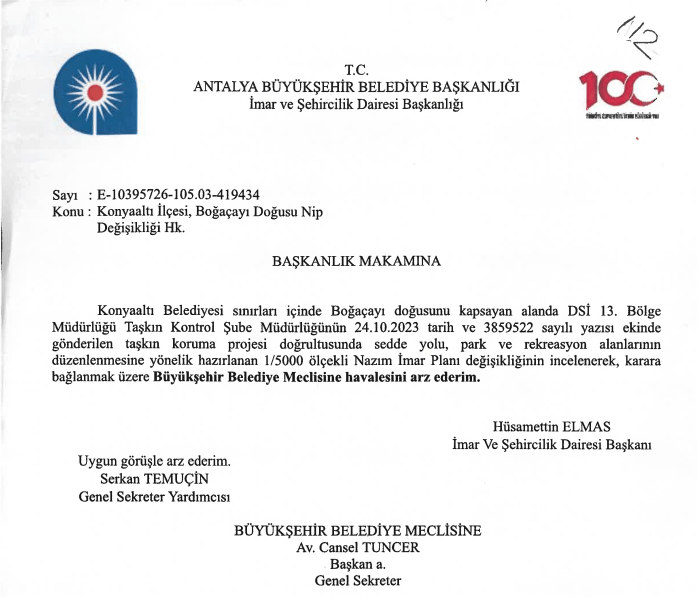 Meclis gündeminin 112. Maddesinde yer alan İmar ve Şehircilik Dairesi Başkanlığının teklif yazısı, “Konyaaltı Belediyesi sınırları içinde Boğaçayı doğusunu kapsayan alanda DSİ 13. Bölge Müdürlüğü Taşkın Kontrol Şube Müdürlüğünün 24.10.2023 tarih ve 3859522 sayılı yazısı ekinde gönderilen taşkın koruma projesi doğrultusunda sedde yolu, park ve rekreasyon alanlarının düzenlenmesine yönelik hazırlanan 1/5000 ölçekli Nazım İmar Planı değişikliği” yapılmasını içeriyor.