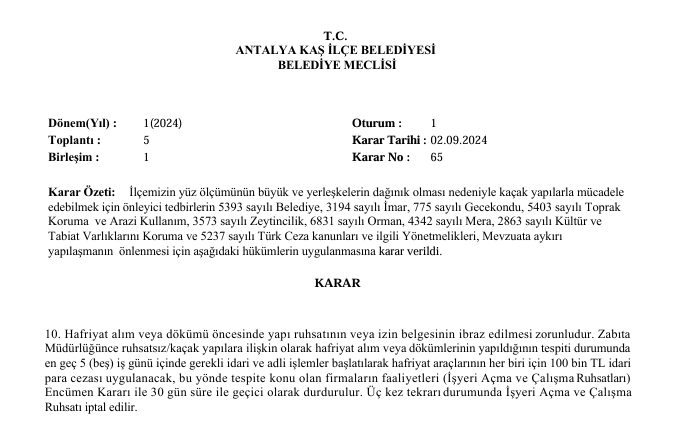 Kaş Belediye Meclisi’nin 2 Eylül 2024 tarihli kararının ayrıntıları, ilgili yasa ve yönetmeliklerle imar mevzuatının tavizsiz biçimde uygulanmasına işaret ediyor. İçişleri Bakanlığı ve Sayıştay denetim raporlarına da konu olan Kaş’taki kaçak yapılaşma ve son 10 yılda verilen tavizlerin alınan yeni Meclis kararı ile son bulup bulmaması, kararların uygulanmasına bağlı.