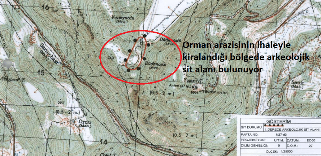 Arkeolojik sit alanı bulunan bölgedeki deniz manzaralı orman arazisinin orman parkı olarak 20 yıllığına özel bir girişimciye kiralanması yargıya taşındı…