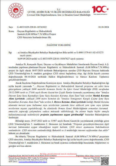 Antalya’nın Konyaaltı ilçesine bağlı Doyran ve Geyikbayırı mahallelerinde yapılması planlanan Doyran HES Projesi’nin ÇED süreci sonlandırıldı.