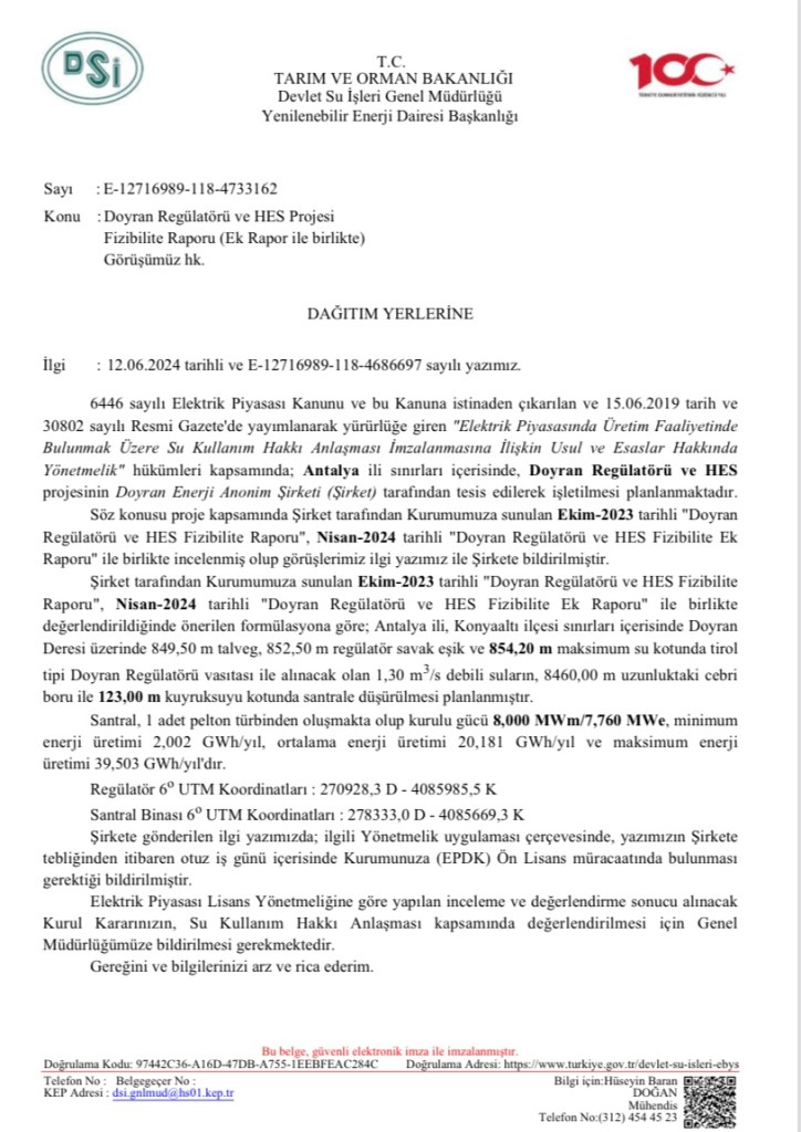 Doyran Deresi üzerinde yapılması planlanan HES projesinin cebri boru güzergâhının içme suyu kaynakları koruma alanında kalması bölge halkının tepkisini çekmişti. 8 Ekim’de Doyran Mahallesi’nde yapılan ÇED toplantısında, projeden etkilenmesi beklenen mahallelerde yaşayan vatandaşlar Doyran HES’in iptalini talep etmişti. İnceleme Değerlendirme Komisyonu (İDK) üyesi olan Antalya Büyükşehir Belediyesi’nin konuyla ilgili yazısında, HES projesinin cebri boru güzergâhının bölgedeki içme suyu kaynakları ve içme suyu kuyularının mutlak koruma alanında kaldığı belirtildi. Çevre, Şehircilik ve İklim Değişikliği Bakanlığı ÇED İzin ve Denetim Genel Müdürlüğü 18 Ekim 2024 tarihli yazısında Doyran HES’le ilgili ÇED sürecinin sonlandırıldığını açıkladı. Alınan karar, ilgili kurum ve kuruluşlara da gönderildi.