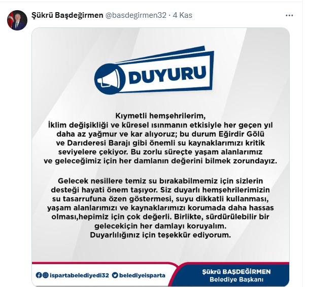 Isparta Belediye Başkanı Şükrü Başdeğirmen, geçtiğimiz hafta sosyal medyadan bir duyuru yayımlayarak kamuoyunun su tasarrufu yapmaya davet etti. Başdeğirmen’in 4 Kasım’da yaptığı su tasarrufu çağrısında şu ifadelere yer verildi: “Kıymetli hemşehrilerim, iklim değişikliği ve küresel ısınmanın etkisiyle her geçen yıl daha az yağmur ve kar alıyoruz. Bu durum Eğirdir Gölü ve Darıderesi Barajı gibi önemli su kaynaklarımızı kritik seviyelere çekiyor. Bu zorlu süreçte yaşam alanlarımız ve geleceğimiz için her damlanın değerini bilmek zorundayız. Gelecek nesillere temiz su bırakabilmemiz için sizlerin desteği hayati önem taşıyor. Siz duyarlı hemşehrilerimizin su tasarrufuna özen göstermesi, suyu dikkatli kullanması, yaşam alanlarımızı ve kaynaklarımızı korumada daha hassas olması, hepimiz için çok değerli. Birlikte, sürdürülebilir bir gelecek için her damlayı koruyalım. Duyarlılığınız için teşekkür ediyorum.”