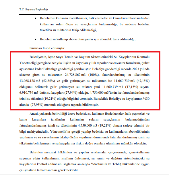 Belediyenin, İçme Suyu Temin ve Dağıtım Sistemlerindeki Su Kayıplarının Kontrolü Yönetmeliği gereğince her yıla ilişkin su kayıpları yıllık raporları ve envanter formlarını, Şubat ayı sonuna kadar Bakanlığa gönderdiğinin görüldüğü bilgisine yer verilen Sayıştay raporunda, “Belediye gönderdiği raporda 2023 yılında sisteme giren su miktarının 24.728.867 m3 (100%), faturalandırılmış su tüketiminin 13.068.128 m3 (52,85%) ve gelir getirmeyen su miktarının ise 11.660.739 m3 (47,15%) olduğunu belirterek gelir getirmeyen su miktarı yani 11.660.739 m3 (47,15%) suyun, 6.910.739 m3’ünün su kayıpları (27,94%) olduğu, 4.750.000 m3’ünün ise faturalandırılmamış izinli su tüketimi (19,21%) olduğu bilgisini vermiştir. Bu şekilde Belediye su kayıplarının %30 altında (27,95%) oranında olduğunu raporda bildirmiştir. Ancak yukarıda belirtildiği üzere bedelsiz su kullanan ibadethaneler, halk çeşmeleri ve kamu kurumları tarafından kullanılan suların sayaçlarının bulunmadığından faturalandırılmamış izinli su tüketiminin 4.750.000 m3 (19,21%) olması sadece tahmini bir bilgi mahiyetindedir” tespitlerine yer verildi.