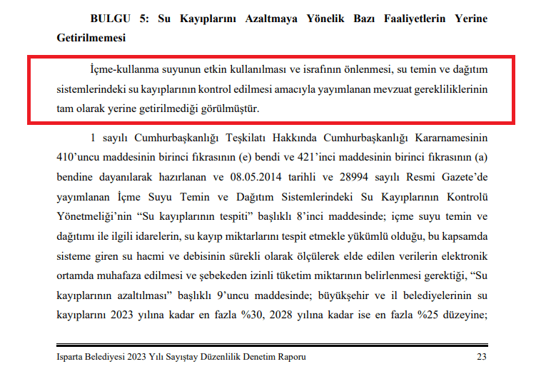 “İçme-kullanma suyunun etkin kullanılması ve israfının önlenmesi, su temin ve dağıtım sistemlerindeki su kayıplarının kontrol edilmesi amacıyla yayımlanan mevzuat gerekliliklerinin tam olarak yerine getirilmediği görülmüştür” denilen Sayıştay denetim raporunda konuyla ilgili Cumhurbaşkanlığı Kararnamesi ve ilgili yönetmeliklere atıfta bulunularak şu ifadelere yer verildi: