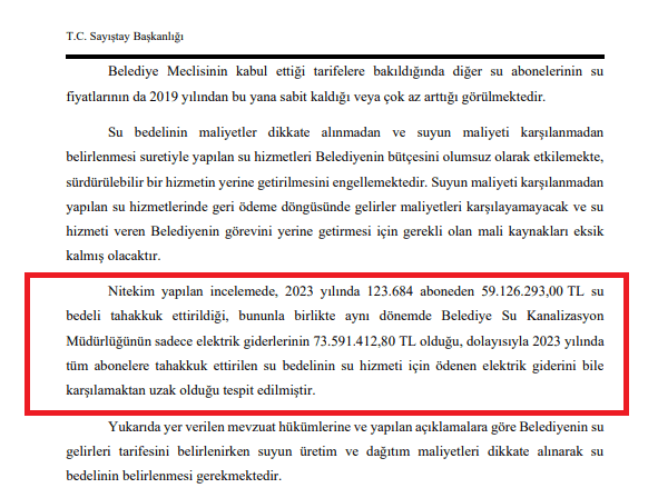 “Belediye Meclisinin su tarifelerini suyun maliyetlerini dikkate almadan maliyetinin oldukça altında belirlediği görülmüştür” denilen raporda, şu bulgu ve görüşlere yer veriliyor: “Yapılan incelemede Belediye Meclisinin su gelirleri tarifesini belirlerken suyun üretim ve dağıtım maliyetlerini dikkate almadan fiyatları belirlediği ve 2019 yılından itibaren su fiyatlarının sabit kaldığı tespit edilmiştir. Belediye Meclisinin kabul ettiği tarifelere bakıldığında diğer su abonelerinin su fiyatlarının da 2019 yılından bu yana sabit kaldığı veya çok az arttığı görülmektedir. Su bedelinin maliyetler dikkate alınmadan ve suyun maliyeti karşılanmadan belirlenmesi suretiyle yapılan su hizmetleri Belediyenin bütçesini olumsuz olarak etkilemekte, sürdürülebilir bir hizmetin yerine getirilmesini engellemektedir.