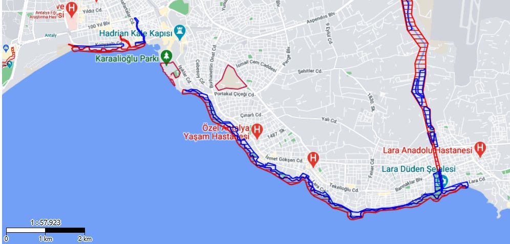 (Antalya falezlerinin koruma statüleri: Mavi taralı alan nitelikli doğal koruma alanı, kırmızı alan ise kesin korunacak hassas alan)