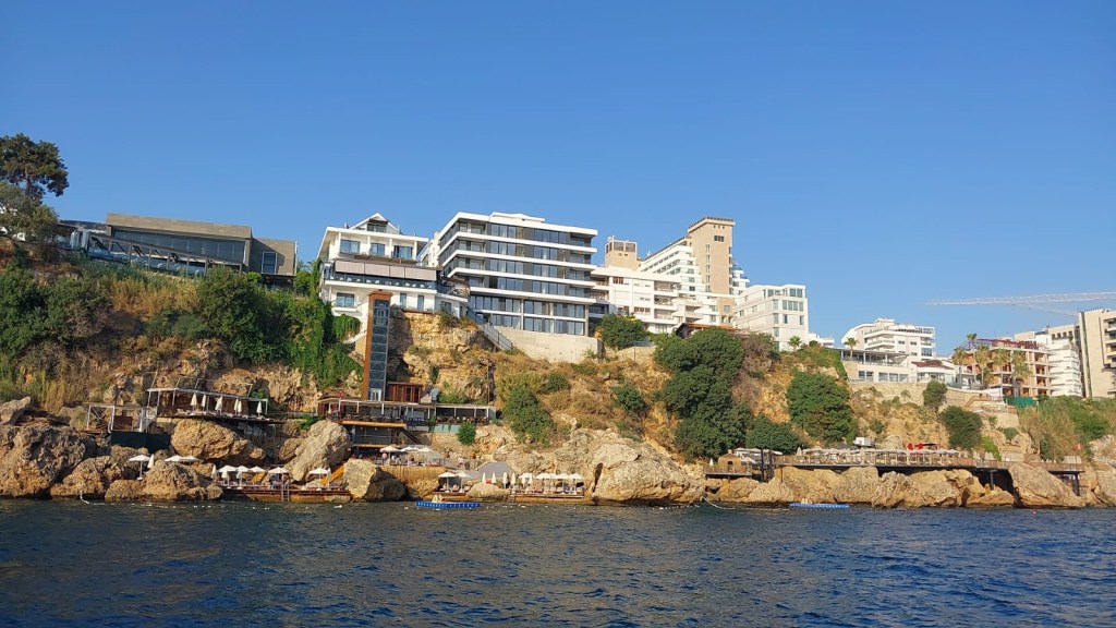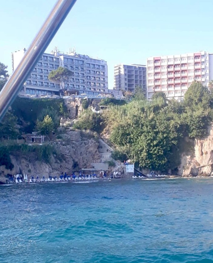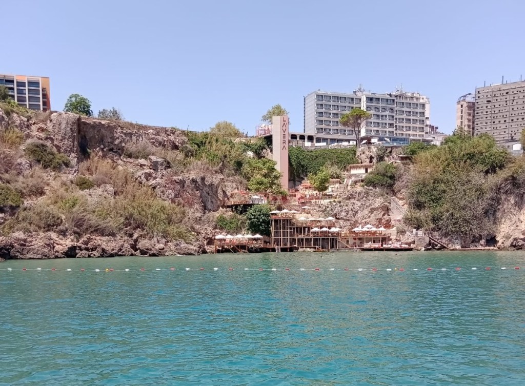 (Antalya’nın ilk 5 yıldızlı oteli olarak bilinen Koç Grubuna ait Talya (Divan) Otelinin yıkılıp yeniden yapılmasıyla falezlerin üzerine daha fazla yük bindirildi. Geçmişte falezlerin içine yapılan ve disko olarak kullanılan mekanın bulunduğu alanın rehabilite edilmesi yerine güçlendirilerek yeni alan kazanma yoluna gidildi. Koç Grubunun patronu Rahmi Koç, denizlerin temizliği konusunda çalışmalar yürüten Turmepa’nın kurucusu ve Onursal Başkanı olarak biliniyor.)