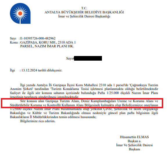Gazipaşa Hepimizin Platformu, konuyla ilgili yaptığı açıklamada, söz konusu alanda kişiye özel imar düzenlemesi yapıldığı eleştirisinde bulunmuştu: “İlçemizin tümünü kapsayan imar planında, sosyal, kültürel, sağlık gibi ortak kullanım alanları zaten çok çok yetersiz, hatta sembolik değerlerde bile değildir. Bu ilçemiz için hazırlanan bilimsel raporlarda da açıklanmıştır. Örneğin ilçemizde yer olmadığı için fen lisesi bir ilkokulun bahçesine, Devlet hastanesi dik bir tepenin yamacına yapılmak durumunda kalınmıştır. Hal böyle iken, özel şirketlerin kazancı uğruna, eldeki kamu alanlarını da çıkarmak akıl işi değildir. Aynı zamanda, bu hazine arazisi dağ köylerimiz de dâhil olmak üzere, 50.000 nüfuslu bir ilçenin önünde, kumsal kıyılarda kamuya ait tek nefes alma noktasıdır.