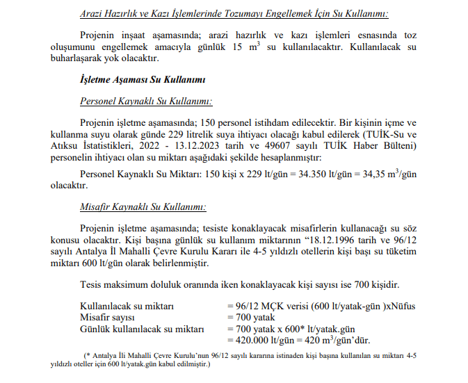Sadece bir otel için toplam 6 ay süreceği belirtilen inşaat çalışması sırasında günde 762,93 ton hafriyat malzemesi çıkacağı, çıkan hafriyatın ise 30 ton kapasiteli kamyonlara yüklenerek taşınacağı belirtiliyor.