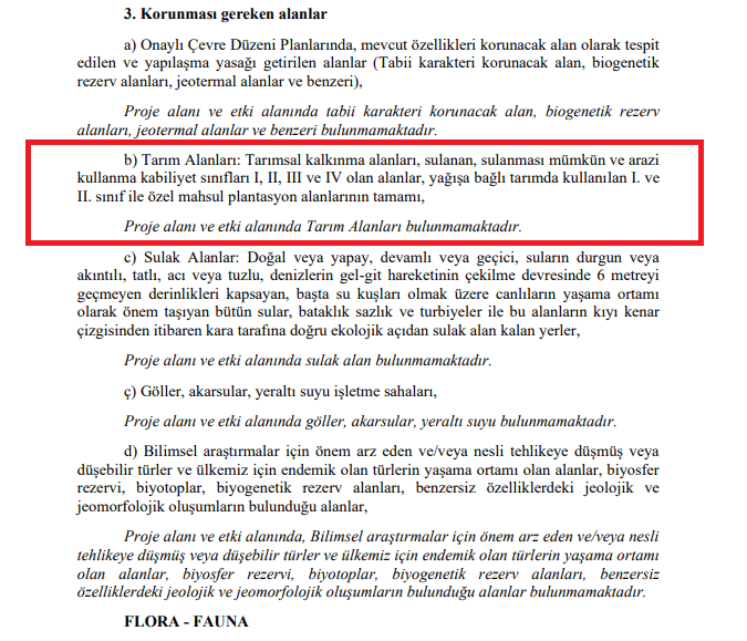 Oteller için tahsis edilen parsellerin ‘arsa’ vasıflı olduğu vurgulanan ÇED dosyasında, “2308 ada 1 parselde, 54.152,78 m2 büyüklüğündeki alan arsa niteliğinde tapulu olduğundan herhangi bir flora ve fauna bulunmamaktadır” deniliyor.