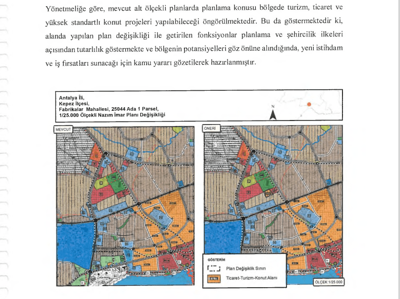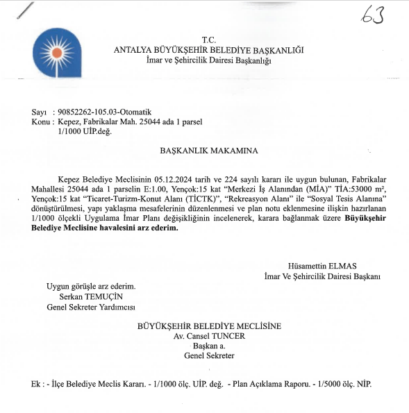 Söz konusu şirketin özel bir planlama şirketine hazırlattığı imar değişikliği talebi, Antalya Büyükşehir Belediyesi’nin 7 Ekim 2024’te yapılan Meclis toplantısının gündemine alındı. İmar değişikliği talebinin gerekçeleri arasında, kentin altyapı, yeşil alan ve planlama bakımından en dezavantajlı bölgelerinden biri olan Kepez’de lüks konut ve otel ihtiyacı bulunduğu iddiaları da yer alıyordu.