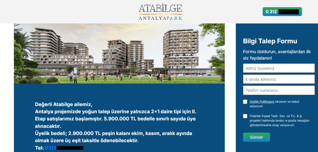 Parselle ilgili imar değişikliği talebinin Ekim ayında belediye gündemine sunulduğu arazide rezidans yapmak isteyen şirketin, bu alanda geliştirdiği projeyi Mart 2024’ten itibaren sosyal medya ve web sitesinden duyurduğu ‘Atabilge Antalya Park’ adıyla satışa sunduğu ortaya çıktı. Şirketin yaptığı duyurularda İBAN numaraları paylaşılarak henüz imar değişikliği onaylanmayan parselde inşa edilecek konutlarla ilgili talep ve ön ödeme toplandığı görüldü.