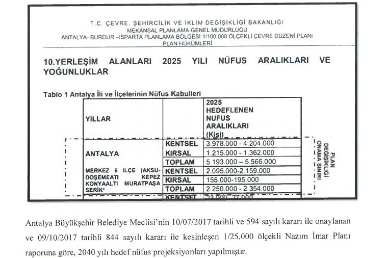 İmar değişikliği talebiyle ilgili plan açıklama raporunda, Çevre, Şehircilik ve İklim Değişikliği Bakanlığı’nın Şubat 2022’de onayladığı 1/100 Bin Ölçekli Çevre Düzeni Planı’nda Antalya’nın 2025 yılı için öngörülen 5 milyon 200 bin kişilik nüfus projeksiyonuna da atıf yapılması dikkati çekiyor: “Bu plana göre, 2025 yılı için hedeflenen nüfus aralıkları şu şekildedir: Antalya genelinde kentsel nüfusun 3.978.000 ile 4.204.000 kişi arasında olması beklenmektedir.”