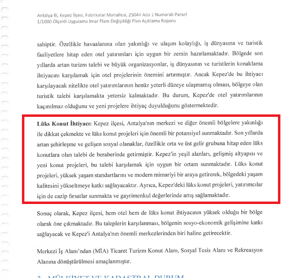 PLAN AÇIKLAMA RAPORUNDA LÜKS KONUT İHTİYACI GEREKÇESİ