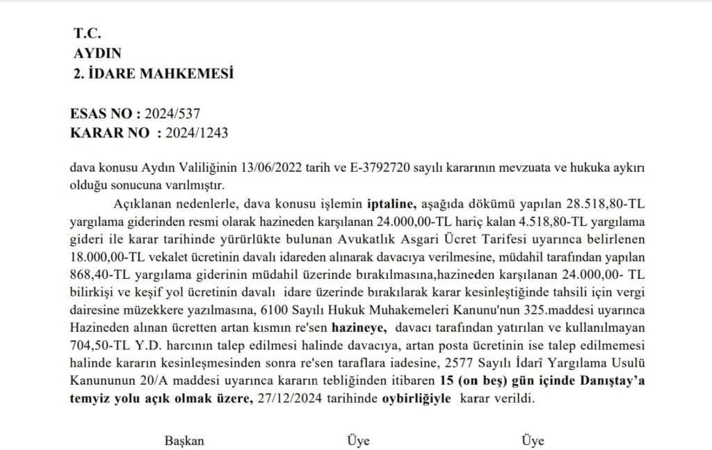 Ancak hassasiyetle korunması gereken bu alanla ilgili çalışmalar sürerken Mayıs 2024’te iş makineleri alana girerek alanı tahrip etmeye başladı. İzinsiz olarak çalışmalara başladığı öne sürülen iş makineleri yöre halkının girişimleriyle durduruldu. Bölgede yaşayan Dursun Sarı tarafından açılan iptal davasına bakan Aydın 2. İdare Mahkemesi, Aydın Valiliği tarafından projeye verilen ÇED Gerekli Değildir kararının hukuka ve Anayasa’ya aykırı olduğuna hükmederek kararı iptal etti.