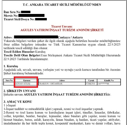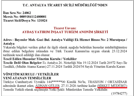 Antalya YİKOB yöneticilerinin de yönetim kurulunda yer aldığı AYDAŞ, daha önce Trabzon Ortahisar’da kafe-restoran ve araç kiralama gibi ticari faaliyetleri olan Adnan Güleş adındaki girişimci tarafından Ankara’da kuruldu. Ticari Sicil Gazetesi verilerine göre Eylül 2023’te ‘Agules Yatırım İnşaat Turizm. A.Ş.’ adıyla Ankara’da kurulan şirket, 3 ay sonra adını değiştirerek 22 Aralık 2023’te Antalya’ya taşındı. Antalya Valiliği’nin Muratpaşa Bayındır Mahallesindeki ek hizmet binasına taşınan şirketin yeni adı ise AYDAŞ oldu. Sermayesi 30 milyona çıkarılan şirketin kurucusu olan Adnan Güleş’in Valilik himayesine alınan AYDAŞ’a Müdür olarak atanması dikkati çekerken Antalya YİKOB yöneticileri de yönetim kurulu üyesi yapıldı. Aralık 2020’de Trabzon’daki yerel bir kanala restoran işletmecisi olarak röportaj veren Güleş’in, pandemi nedeniyle esnafın zor durumda olduğunu belirterek yetkililerden destek talep etmesi dikkati çekiyor.