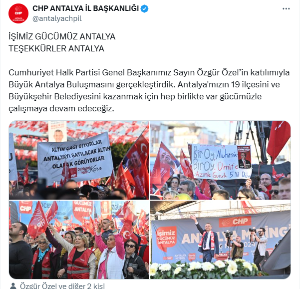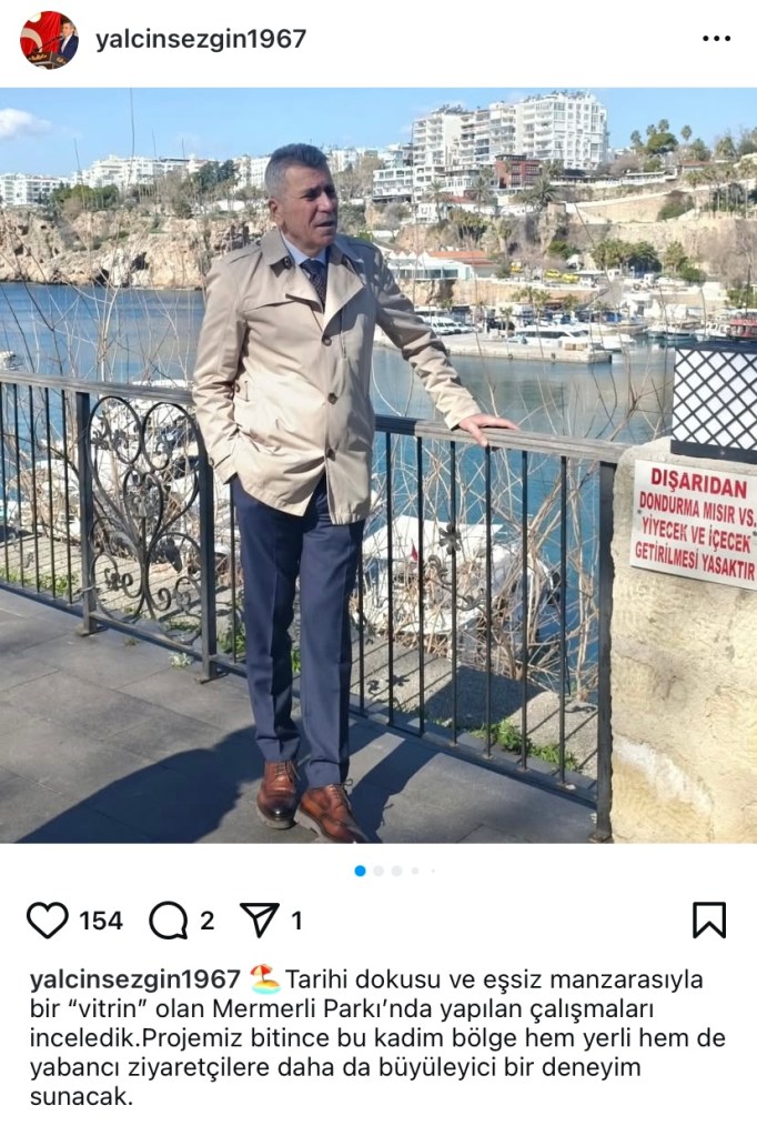 Aynı zamanda AYDAŞ A.Ş.’nin Yönetim Kurulu Üyesi de olan Vali Yardımcısı Sezgin, dün yaptığı bir başka paylaşımda ise “İşimiz Gücümüz Antalya” sloganıyla Mermerli Plajı ve çevresindeki çalışmalardan fotoğraflara yer verdi. Sezgin’in kullandığı bu slogan, 31 Mart 2024 tarihinde yapılan Mahalli İdareler seçimleri öncesinde CHP Antalya Büyükşehir Belediye Başkanı Muhittin Böcek ve CHP’nin ilçe belediye başkan adaylarının sıklıkla kullandığı bir slogandı.