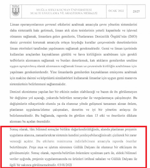 Deniz taraması ve deniz içi faaliyetleriyle dipte birikmiş olan organik madde ve kirleticilerin nispeten kapalı olan Güllük Körfezi’nin tamamının su kalitesi parametrelerini uzun süreli olarak etkileyeceğinin altını çizen uzmanlar, şu görüşleri dile getiriyor: “Akıntı hızının da az olduğu zaten raporda da belirtildiği ortadayken, bu süspanse olan kirleticilerin deniz yaşamı üzerinde uzun süreli ve geri dönüşü olmayacak etkiler yaratacağı aşikârdır. Bu olumsuzluklardan ne yazık ki diğer deniz sektörleri de olumsuz etkilenecektir. Doğal deniz ekosistemine olan etkilerin, halk sağlığını veya balık çiftliklerini etkilemeyeceği düşünülemez. Onlarca yıldır kendi içinde alan rekabeti olan ve her birinin varlığı ve kazancı direkt olarak sağlıklı deniz ekosistemine ve deniz suyu parametrelerinin iyi olmasına bağlı olan turizm, balıkçılık ve balık yetiştiriciliği sektörlerinin tüm yatırımlarının üzerine adeta dinamit atılacaktır. Bunca yıldır toplumun ve bilim insanlarının en iyi koruma ve kullanım dengesini sağlamak için gösterdiği çaba ve hassasiyetin üzerine de dinamit atılmaktadır. Güllük Körfezi ve Dalyanı’nın mevcut ekolojik sorunlarının raporda ele alınış ve yorumlanış biçimi ise yine tam bir akıl tutulmasıdır.”
