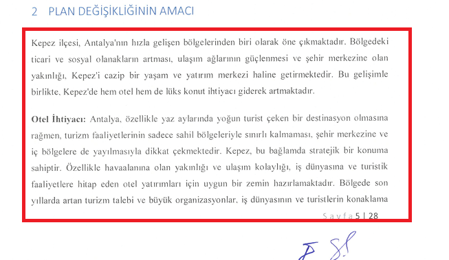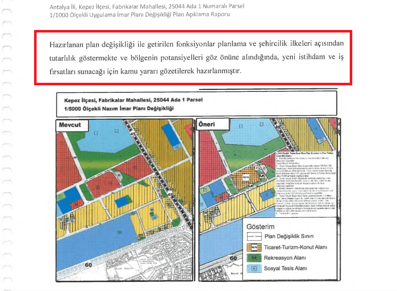Plan değişikliği talebinin gerekçeleri arasında, Kepez ilçesindeki lüks konut ve otel ihtiyacı bulunduğu öne sürülmüş, bu alanda yapılacak rezidans projesinin bölgenin gelişmesine katkıda bulunacağı savunulmuştu. Mahalle sakinleri ise 15 katlı projenin bölgede altyapı ve ulaşım sorunlarına neden olacağını savunarak Antalya Büyükşehir Belediyesi’ne itirazda bulunmuşlardı.
