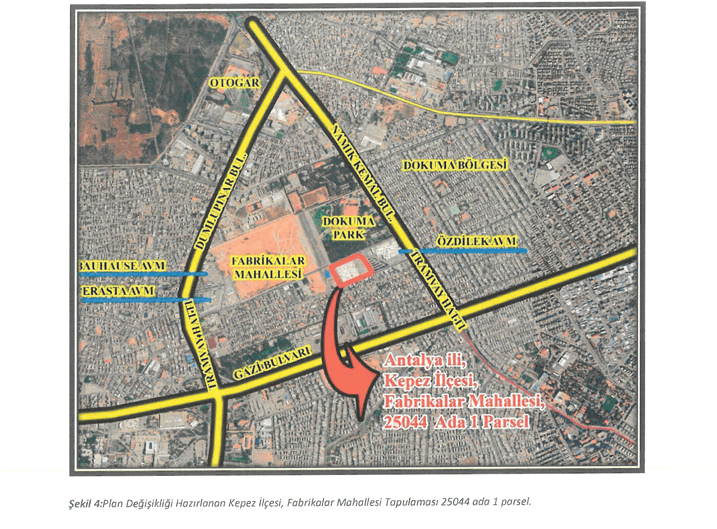 Kepez Fabrikalar Mahallesi’nde yer alan 32 bin m2’lik parselde bulunan 2 katlı KİPA AVM’nin yerine otel, konut ve ticari alan kullanımlarını içeren 15 katlı rezidans yapılmasının önü açılmıştı. Meslek odaları ve mahalle halkının büyükşehir belediyesine yaptığı itirazlar reddedildi. Bunun üzerine Harita ve Kadastro Mühendisleri Odası ile mahalle sakinleri düzenlemeyi yargıya taşıma kararı aldı. Antalya Barosu’nun desteğiyle yürütülecek hukuki süreçte, kişiye özel ayrıcalıklı imar hakkı elde edildiği eleştirilerine neden olan düzenlemenin iptali talep edilecek.