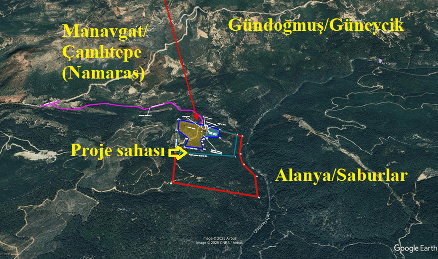 Gündoğmuş’un Güneycik, Manavgat’ın Çamlıtepe (Namaras) ve Alanya’nın Saburlar mahallelerinin sınırlarının kesiştiği vadi, kızılçam ormanlarıyla kaplı. Proje sahası, kuraklıktan etkilenen Alara Çayı’nın batısındaki orman arazisinde yer alıyor.