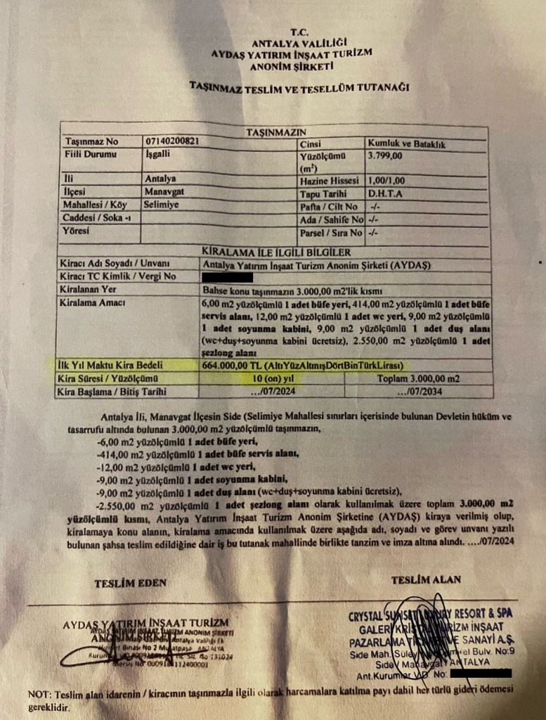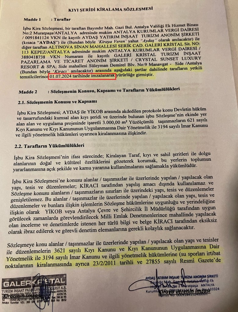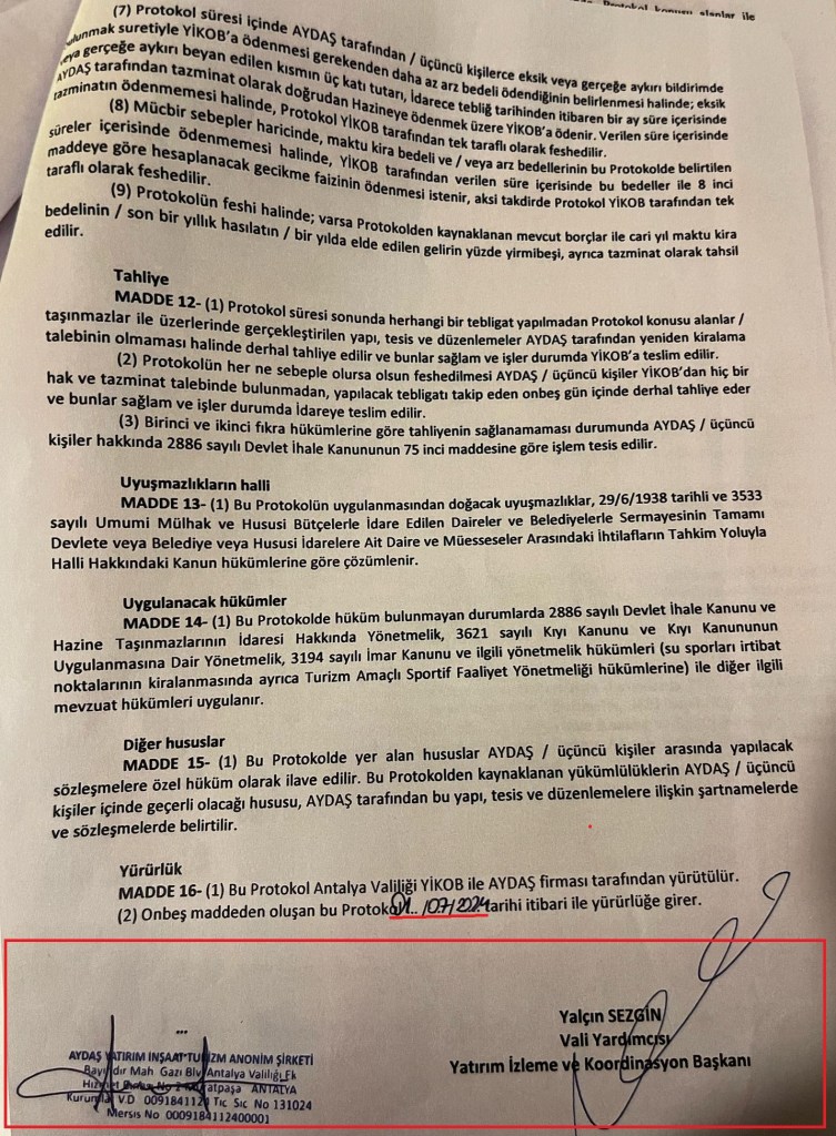 Antalya YİKOB, Kaymakamlıktan kiraladığı bu alanı 1 Temmuz 2024 tarihinde yapılan protokol ile kendi şirketi olan AYDAŞ’a kiraladı. Ancak bu kiralama protokolünde imzası olan YİKOB Başkanı ve Antalya Vali Yardımcısı Yalçın Sezgin’in, aynı zamanda sahili kiralayan valilik şirketi olan AYDAŞ’ın da yöneticisi olması dikkat çekiyor.