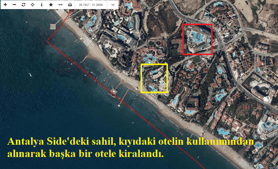 Antalya’nın Manavgat ilçesine bağlı Side (Selimiye) Mahallesi’nde hazineye ait 3 bin metrekarelik sahille ilgili tahsis tartışması yargıya taşındı. Daha önce bir otelin kullanımında bulunan sahil, önce Antalya YİKOB’a kiralandı, ardından YİKOB bünyesinde kurulan AYDAŞ şirketine devredildi. AYDAŞ şirketi ise aynı gün içinde sahili 10 yıllığına bölgedeki bir başka otele kiraladı. Valilik şirketinin aynı gün içinde iki ayrı protokole imza atarak sahili üçüncü kişilere kiralamasının ihale kanunu ve ilgili mevzuata aykırı olduğu öne sürülürken, tartışmalı kiralama işlemi yargıya taşındı.