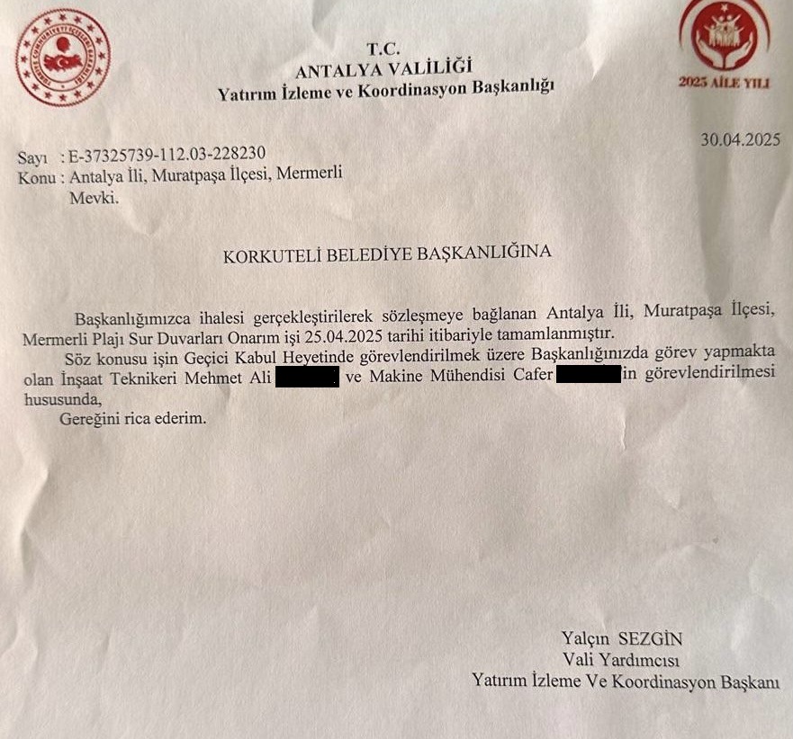 Antalya Vali Yardımcısı ve YİKOB Başkanı Yalçın Sezgin’in sık sık denetim yaptığı görülen Mermerlideki çalışmalar hızla sürerken 30 Nisan 2025 tarihli bir yazıyla onarım işinin tamamlandığı belirtildi. Vali Yardımcısı Sezgin’in imzasını taşıyan resmi yazı CHP’nin yönetimindeki Korkuteli Belediyesi’ne yazılmıştı ve ilçe belediyesinden Mermerlide tamamlandığı belirtilen işlerin geçici kabulü için iki teknik personel görevlendirilmesi isteniyordu. Antalya’da çok sayıda teknik uzman ve personel bulunmasına karşın, Sezgin’in memleketi de olan Korkuteli’nden isimleri de verilerek biri ‘tekniker’, diğeri de makine mühendisi olan iki personelin tamamlanan işe imza atmak için istenmesi kafaları karıştırdı. İdare personelinin yapılan işlerde hatalar olduğu gerekçesiyle geçici kabule imza atmak istemediği iddiası da gündeme geldi.