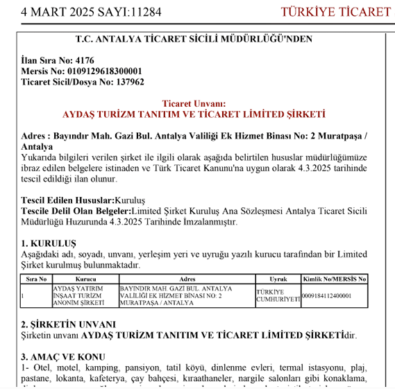 AYDAŞ AŞ YENİ BİR ŞİRKET DAHA KURDU, KEMER’DEN MÜDÜR ATADI