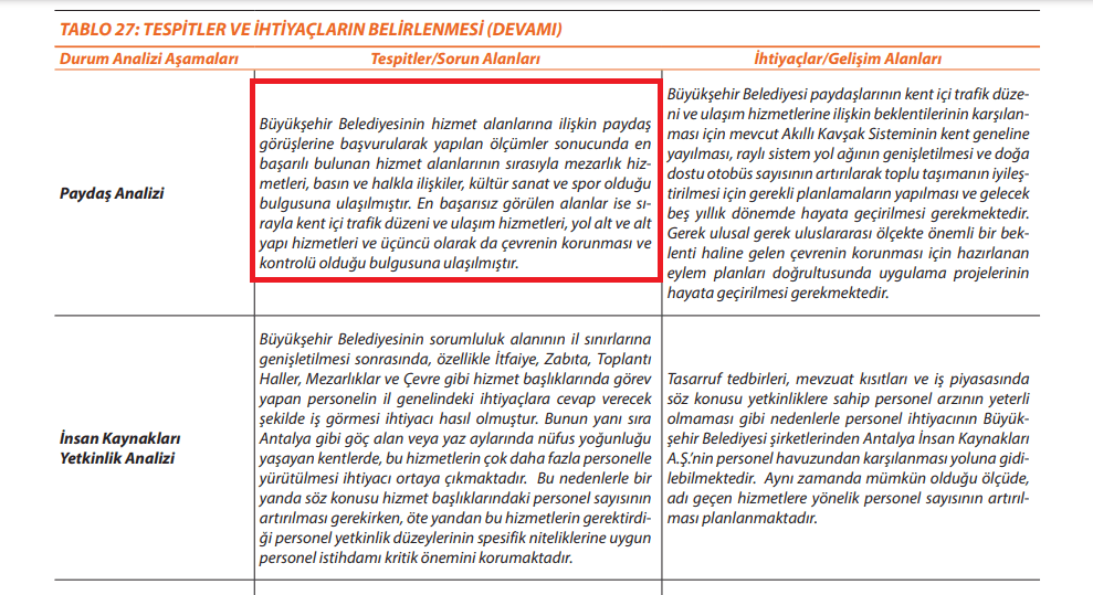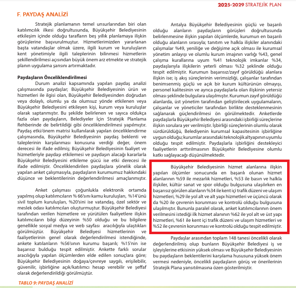 Özetlediğimiz bu tablo aslında, eleştirilerin odağında olan Antalya Büyükşehir Belediyesi’nin hazırladığı 2025-2029 dönemini kapsayan Stratejik Plan’da da karşılık buluyor. Yöneticilerin ve üst düzey bürokratların günü kurtarmaya dönük sosyal medya paylaşımlarının nasıl da köpüğe dönüştüğü, bizzat idarenin hazırladığı Stratejik Plan raporunda çarpıcı biçimde yer alıyor.