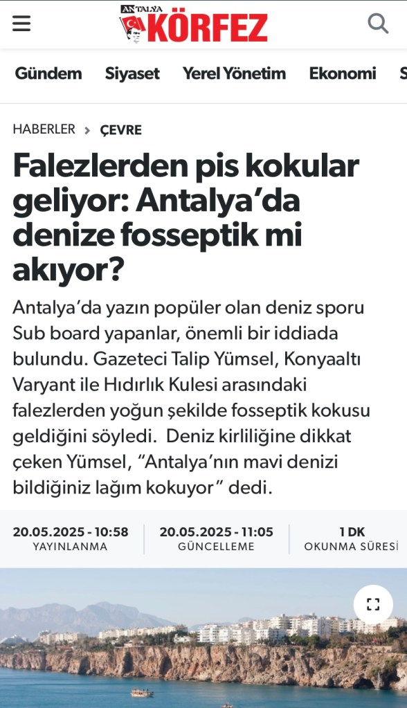 Ancak aynı gün yerel basında yayınlanan haberlerde, Konyaaltı falezlerinin olduğu bölgede deniz kirliliğine işaret edilerek vatandaşların şikâyetlerine yer veriliyordu. Deniz yüzeyinde görülen kirliliğin fotoğraflarına yer verilen haberlerde, vatandaşların “deniz lağım kokuyor” isyanı yansıtılıyordu. Konuyla ilgili Büyükşehir Belediyesine yapılan başvuruların sonuçsuz kaldığından dert yanan vatandaşların paylaşımlarının gündem olduğu gün teknecilerin sintine alımında da sorunlar yaşandığı haberleri yansıdı yerel basına. Haberlerde, teknelerin limana döndüklerinde tesislerin kapalı olması nedeniyle atıklarını veremediklerine dikkat çekilerek, pompaların arızalı oluşu ya da tesislerin dolu olması nedeniyle Kaptanların atık veremedikleri iddiasına yer verildi.